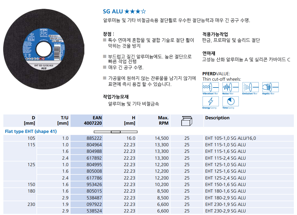 연삭중의 열 발생을 줄여주어 열자국이 없고 높은 연삭성능과 긴 수명을 지닌 페어드 절단휠입니다.
